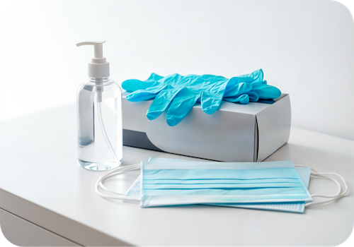 Typische Inhalte einer Pflegebox sind Einmalhandschuhe, Desinfektionsmittel, Mundschutz, Schutzschürzen und Bettschutzeinlagen zum Einmalgebrauch.